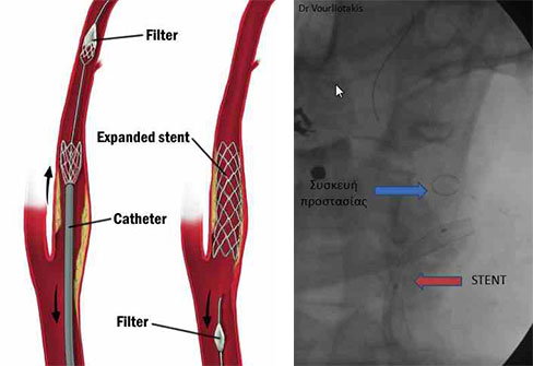 Η ενδαγγειακή αποκατάσταση της στένωσης της έσω καρωτίδας πραγματοποιείται υπό τοπική αναισθησία και περιλαμβάνει την τοποθέτηση ειδικού μεταλλικού ενδοαυλικού νάρθηκα (stent) και την αγγειοπλαστική με μπαλόνι.